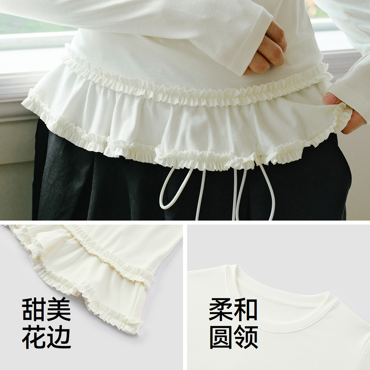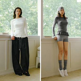 森马长袖 T恤女冬纯色木耳边气质紧身2025新款 荷叶边上衣简约甜美抖音小红书同款网红热销 - T恤 - 淘宝网